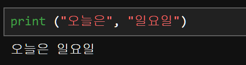 | 여러 값을 출력하려면 print 함수에서 쉼표로 구분해 주면 됩니다. 따라서 오늘은 다음에 공백이 하나 있고 일요일이 출력됩니다. |
