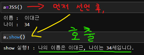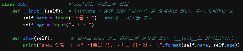 클래스 속성(self.name, self.age)을 설정하고, show() 메서드를 통해 해당 속성을 출력하도록 구현했다.