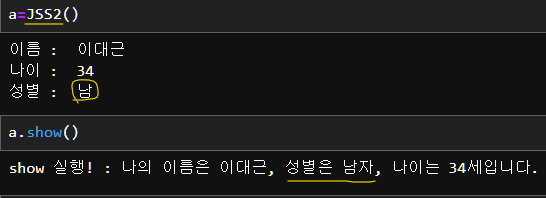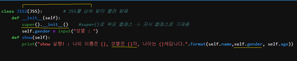 - 추가로 self.gender라는 새로운 속성을 정의하고, show() 메서드를 재정의하여 확장된 정보를 출력하도록 만들었다.