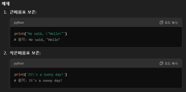 - 백슬래시( \ )를 사용하면 따옴표를 문자열 내에서 보존하고 출력할 수 있습니다.