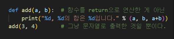 return과 print는 겉보기에는 비슷해 보일 수 있지만, 완전히 다른 역할을 한다.return의 역할함수의 결과값을 반환한다.반환된 값은 다른 변수에 저장하거나, 다른 연산에 사용될 수 있다.함수가 호