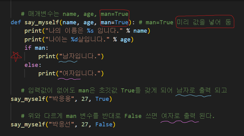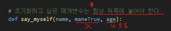 | 오류 메시지 : SyntaxError: non-default argument follows default argument ‘초깃값이 없는 매개변수(age)는 초깃값이 있는 매개변수(man) 뒤에 사용할 수 없다’ 라는 뜻 |