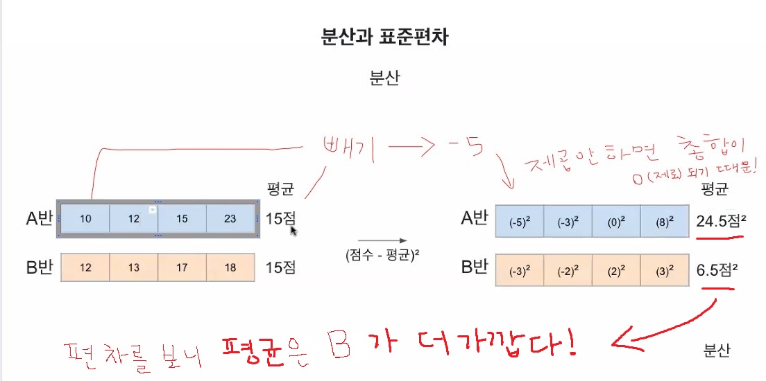- 표준편차가 작을수록 데이터가 평균에 가깝게 분포함.