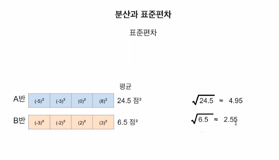 - 예: A반의 분산은 24.5, B반의 분산은 6.5.
